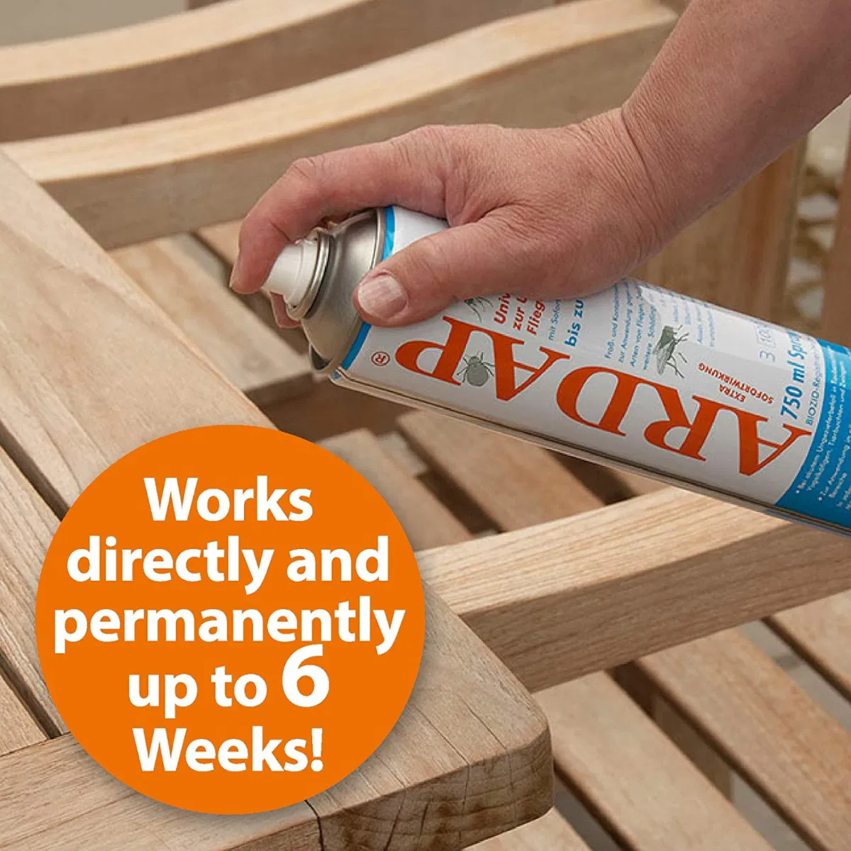 Shake can well before use. Spray places favoured by vermin and flies with ARDAP spray from a distance of approx. 30 cm until their surfaces appear slightly damp. Do not spray until visibly wet and dripping, streaking. For very sensitive and polished surfaces, first carefully carry out a trial treatment. For wasps: Only use in case of danger (threat) or by professional users. Do not use against protected species such as gyro wasps, button horn wasps, club horn wasps or dagger wasps.