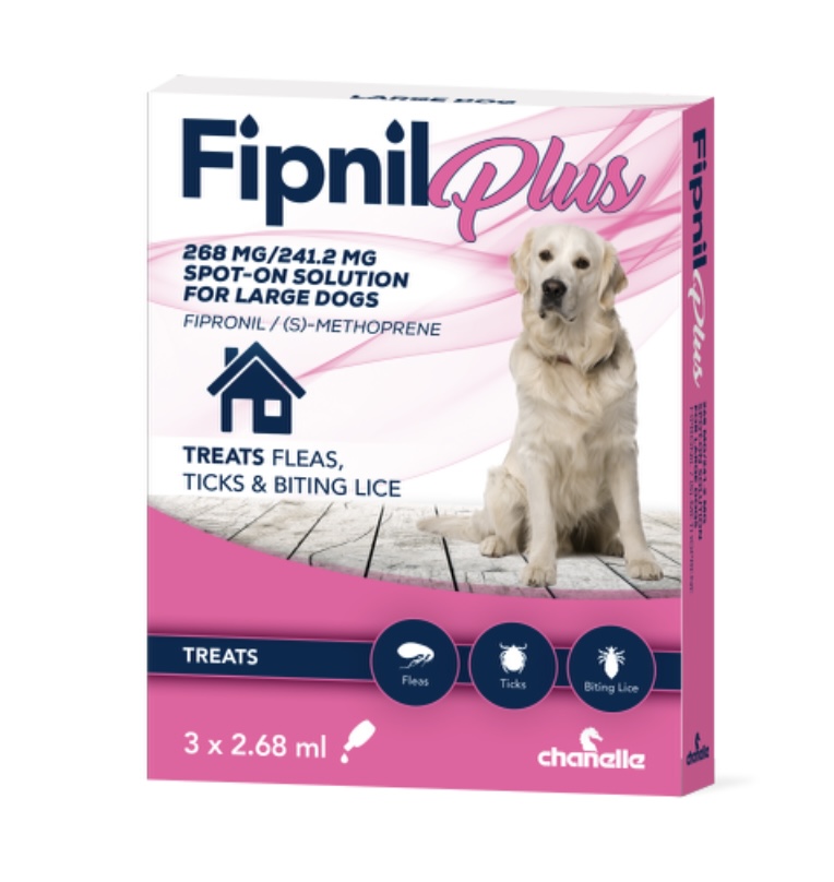 Fipnil Plus Large Dogs is a Fipronil/Smethoprene monthly spot-on solution designed to kill and prevent fleas, ticks and biting lice on dogs. For dogs weighing between 20-40kg and licenced AVM-GSL