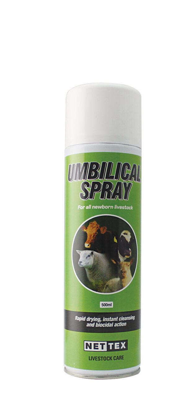 Instant cleansing, broad-spectrum disinfectant for use on umbilical cords in newly born livestock. Contains anti-bacterial agents, is rapid drying, and is easily identifiable once sprayed.