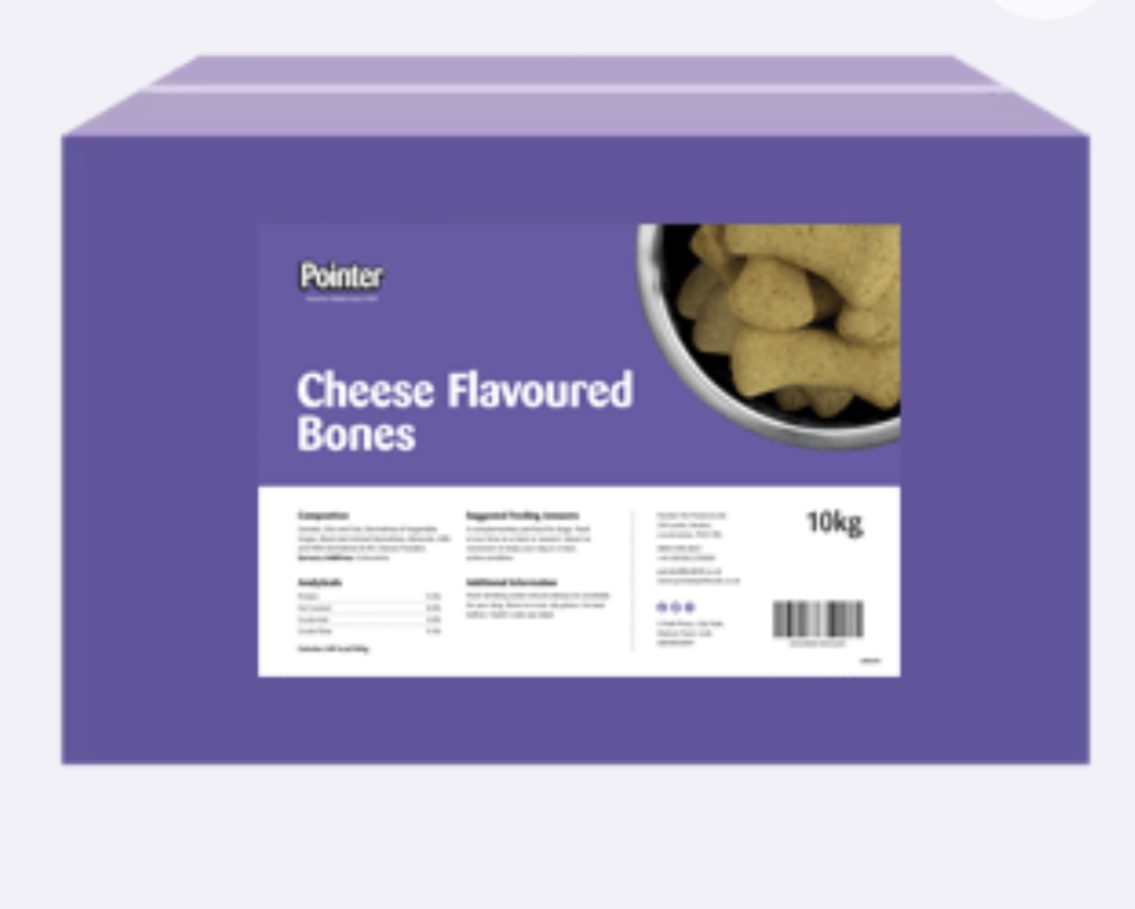 Pointer Cheese Flavoured Bones are a naturally oven baked biscuit. Baked to a crunchy perfection, they are great for helping to keep teeth clean and breath fresh. Ideal as a training treat or as a tasty snack between meals. A complementary pet food for dogs from 12 weeks of age.