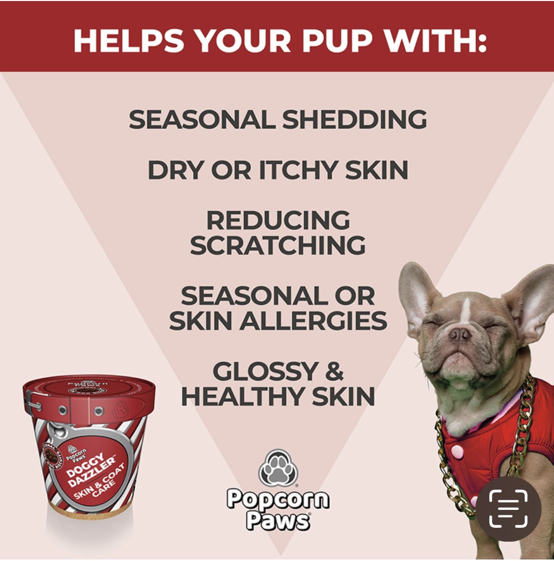 Popcorn Paws® Doggy Dazzler is a soft, functional biscuit treat that supports healthy skin and a glossy coat — without fuss, filler, or force-feeding. Developed for dogs who suffer from dry skin, seasonal itching, excess shedding or lacklustre coats, this daily treat combines high-quality ingredients with proven benefits for skin health, inflammation reduction and nutrient absorption.